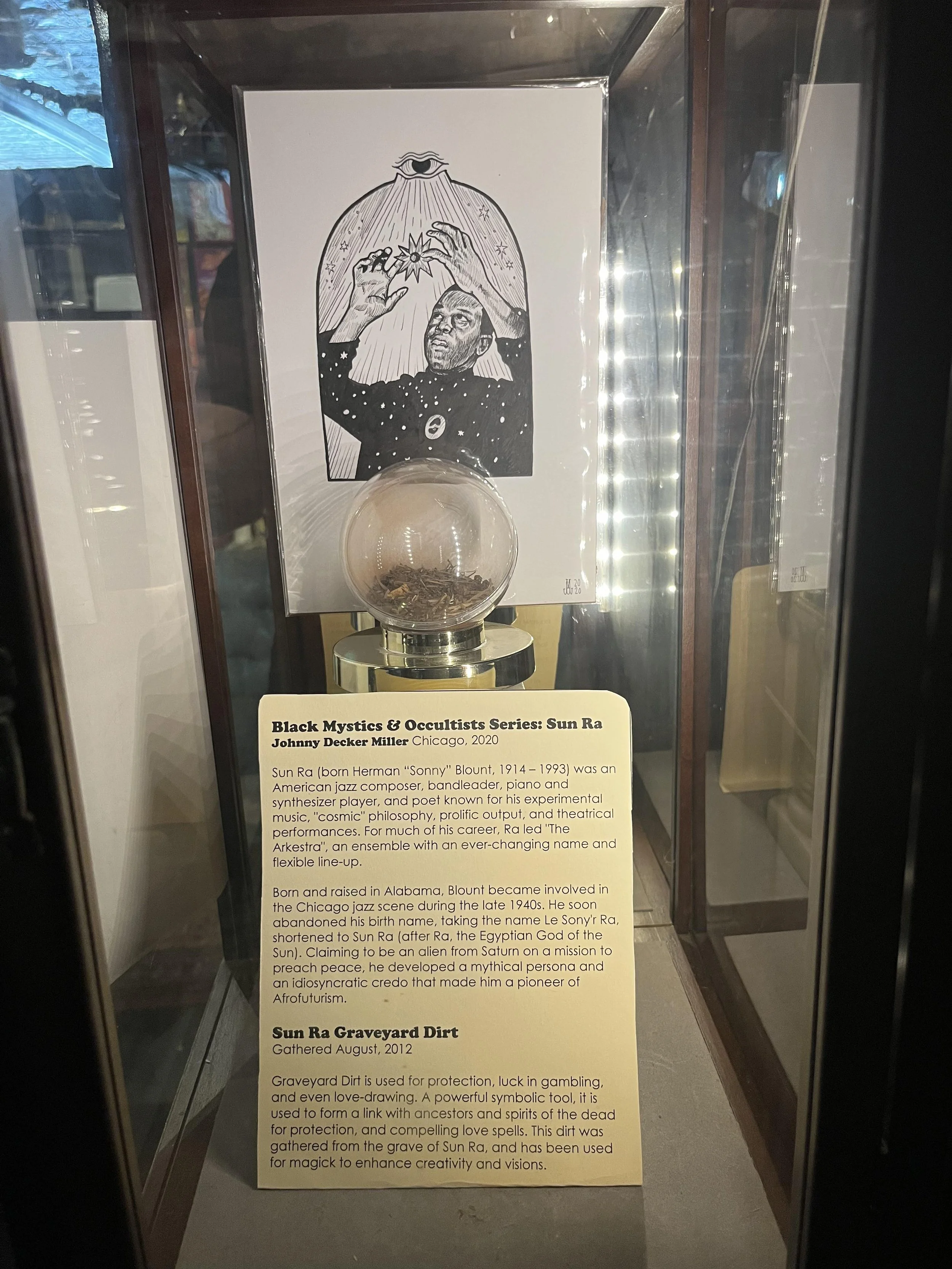 Folks like Rik Garrett and Johnny Decker Miller both have contemporary pieces on display. An original Rik Garret print from his 2014, Fulgur Press-published work Earth Magic can be discovered. Not to mention, a mystical vision of afro-futurist jazz musician Sun Ra created for Johnny Decker Miller’s 2020 Black Mystics & Occultists series.