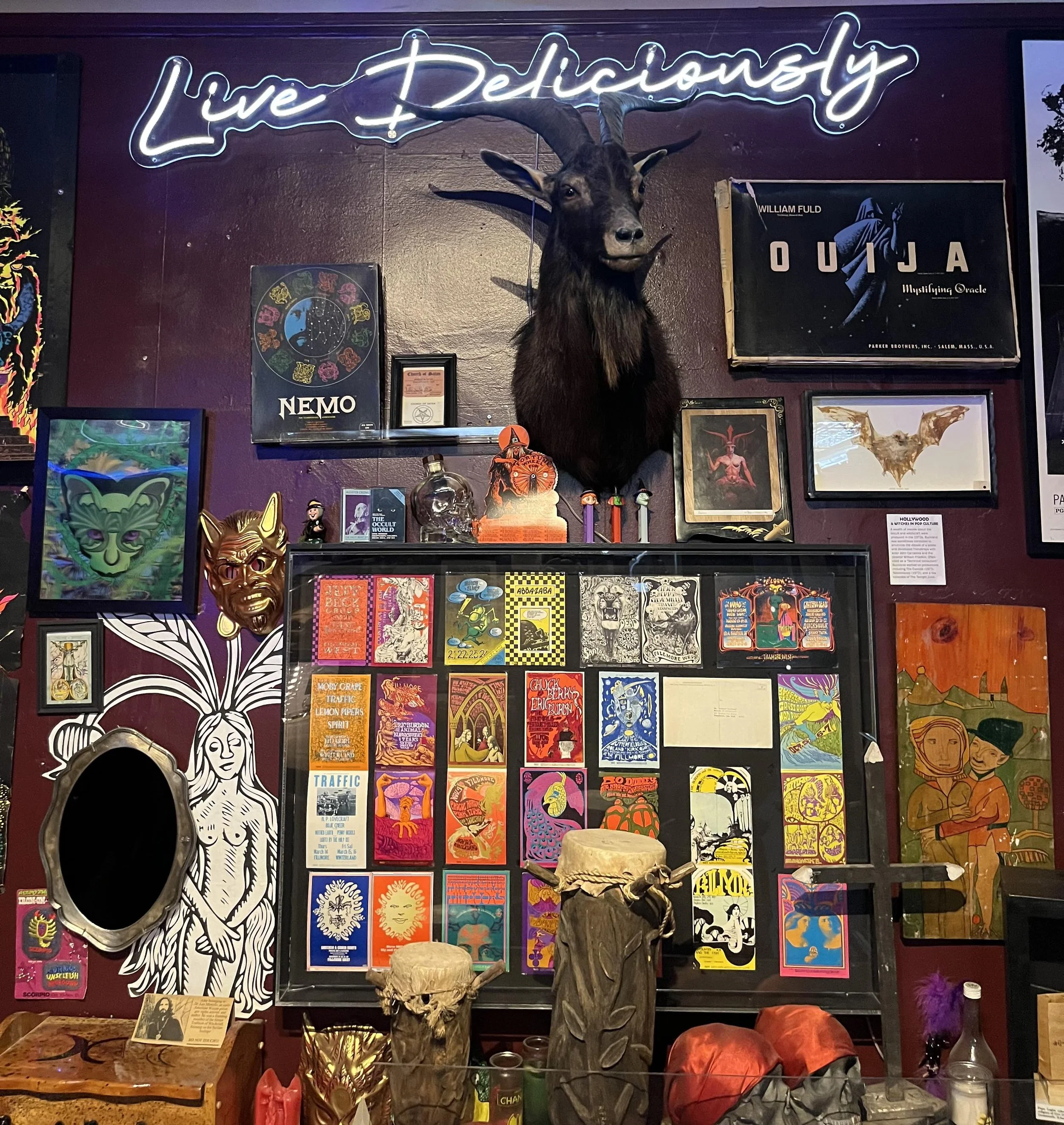 One exhibit, entitled Six-Six-Sixties, features imagery and materials detailing with magickal aspects of the counterculture of the 1960’s. On the wall above the exhibit, a large goat’s head bears a neon sign which reads “Live Deliciously” — a nod to the Robert Eggers 2015 A24 film The VVitch.