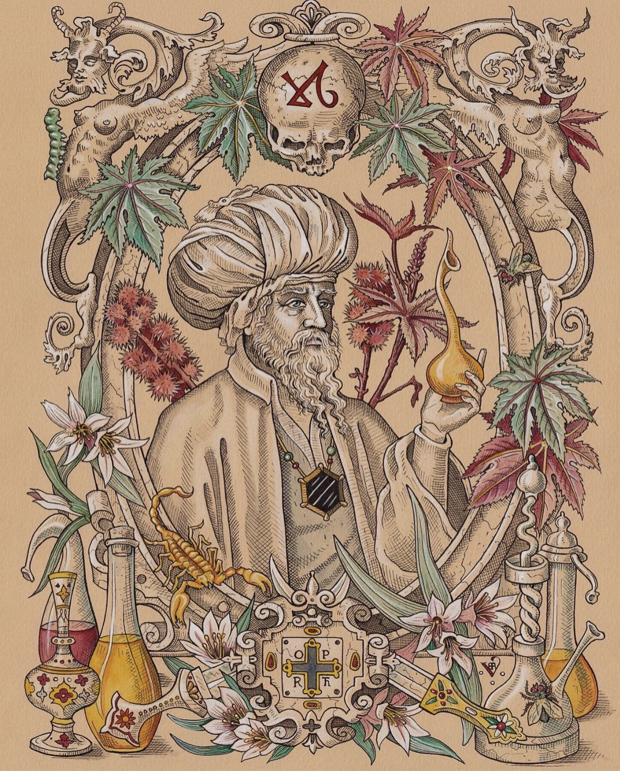 Consider, for example, the inimitable works of Benjamin A. Vierling. Based in California, Vierling’s work has been featured in a number of unique occult publications. Perhaps most notable, those of Three Hands Press. The recent Three Hands Press publication The Green Mysteries contains hundreds of vierlings illustrations – cover art, full color plates, accompanying designs, and even marginalia. One such piece is the formidable illustration entitled The Alchemist, Wahshiyya, seen below.