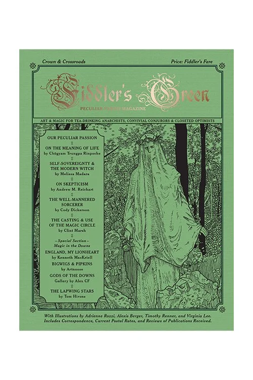 Fiddler’s Green Peculiar Parish Magazine presents essays on individual awakenings to magic in our fourth issue. These 44 pages include art and writing on the seductive nature of spiritual striving, the possibilities of voluntary wonder, self-sovereignty, etiquette, Goetic magic, the eeriness of the English countryside, the powerful messages and entities in Watership Down, and a poem on initiation and landscape. In his opening editorial, Clint Marsh reflects on our collective creation of Fiddler’s Green over the course of the series so far. With letters from readers, reviews of publications received, and instructions for oracular wishing well magic by Craig Conley. 48 illustrations.