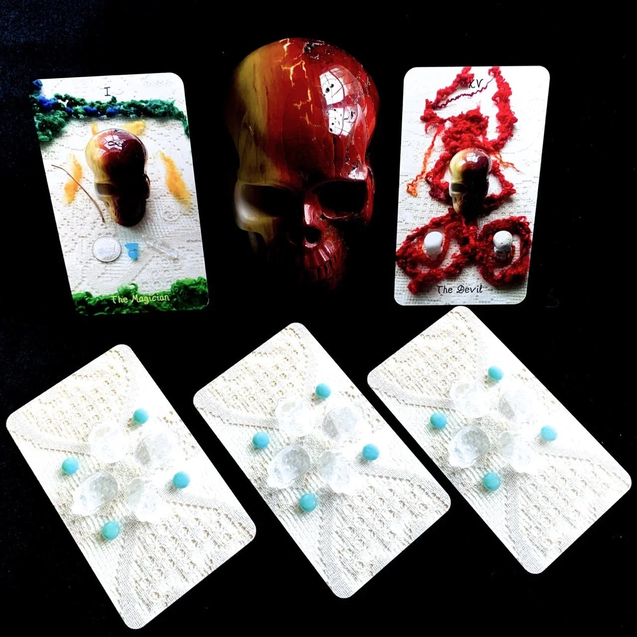 Skulls can be thought of as containers for consciousness, and crystal skulls are effective conduits for both intention and intuition. Crystal Skulls Tarot came to fruition after years of personal practice with crystals, crystal skulls, and Tarot. Skulls were chosen intuitively for each card, based on the colors, feel, and properties of the stones from which they were carved, and how those properties connected to the meanings of the cards. Crystal Skull Tarot is a photographic deck that follows the Rider Waite Smith system, and many of the images are direct homages to the classic RWS Tarot. All photographs were taken in natural window light, using a handmade antique tablecloth as a background. This handmade cloth, and the minerals that formed in the earth many years ago, are connections to ancestors and time-honored wisdom. In addition to the minerals, color comes in splashes of both natural colored and hand-dyed wool, some in lock form and some handspun into art yarn. The wool has energy programmed into its very structure, and its presence adds a palpable spark to the images.