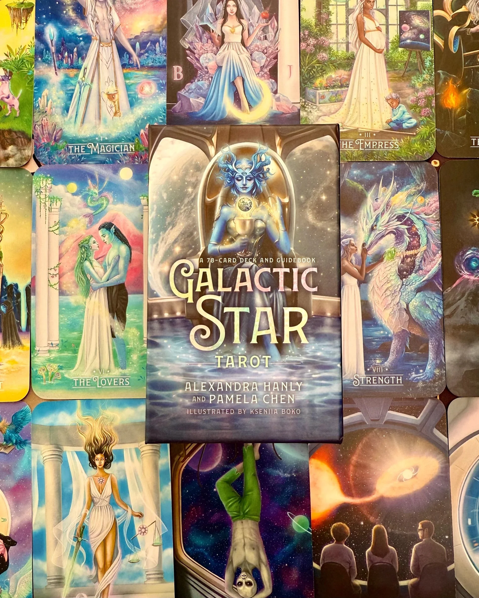 Explore the deeper meanings of tarot with a little help from your Star Guides, an extensive array of Star Beings from diverse places across the Milky Way galaxy. In THE GALACTIC STAR TAROT, you’ll meet the Lyrans of the Wands, the Pleiadeans of the Cups, the Sirians of the Swords, and the Arcturians of the Disks who’ve sworn to protect and support you and all other humans and Starseeds on Earth. Intricately detailed art takes you from the desert of Area 51 on Earth to royal courts held upon starships and everywhere in between. When you reconnect to memories of your galactic history and the infinite potential of the Universe, miracles happen. Activate the star magic within you and awaken to a new realm of abundant blessings.