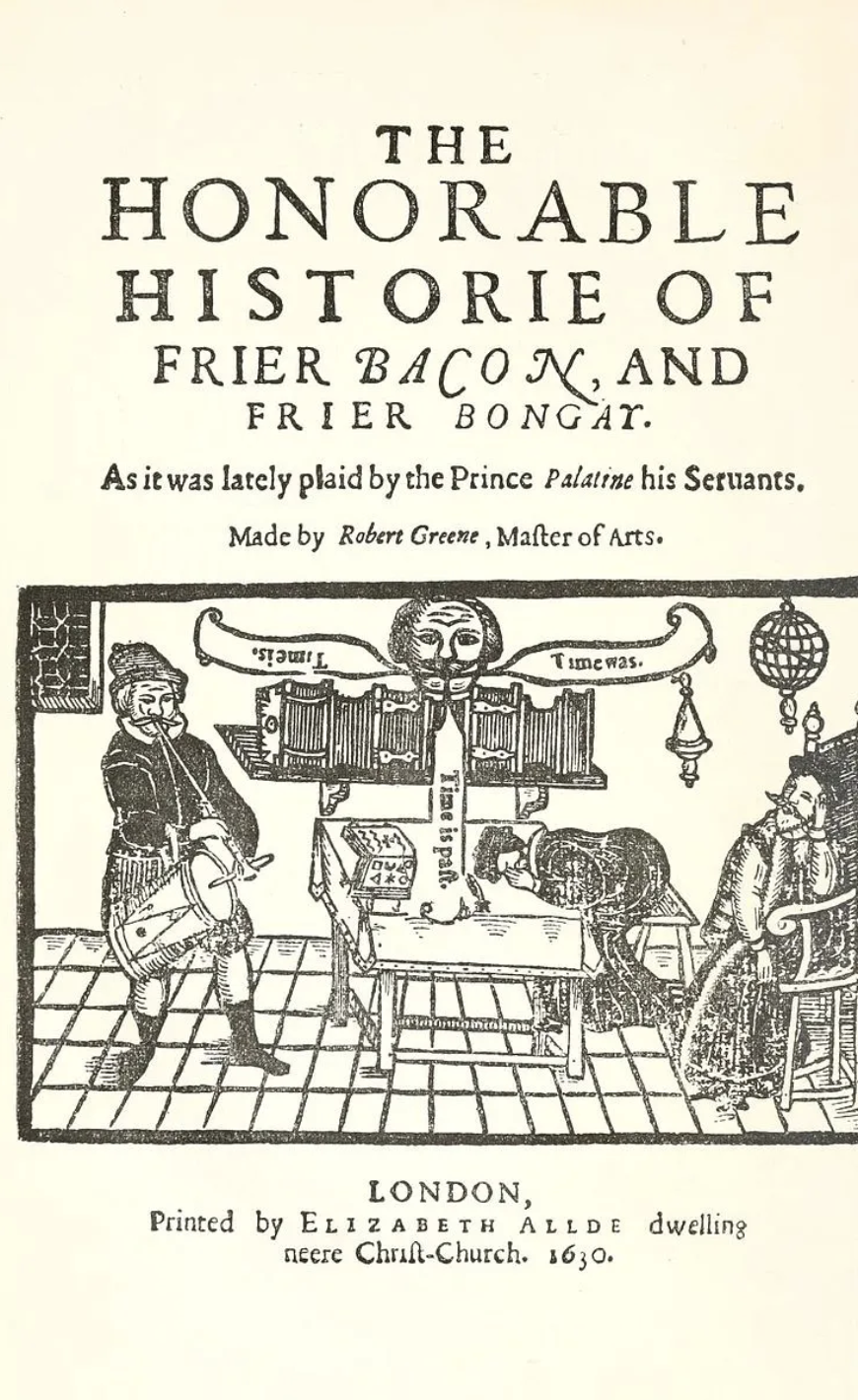 Title page of the 1630 printing of Friar Bacon and Friar Bungay. The engraving shows the magical talking brazen head at top. Title page of reprint of 1630 edition of Robert Greene's Friar Bacon and Friar Bungay. Via Wikimedia Commons. Public Domain.