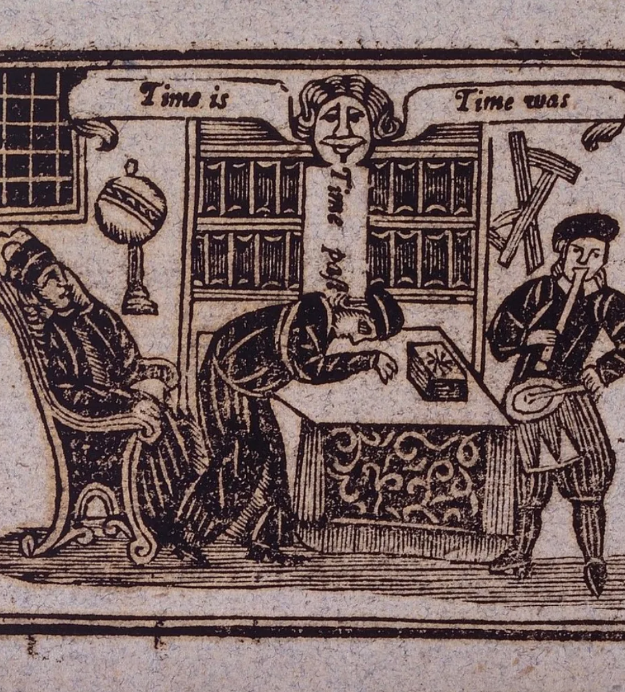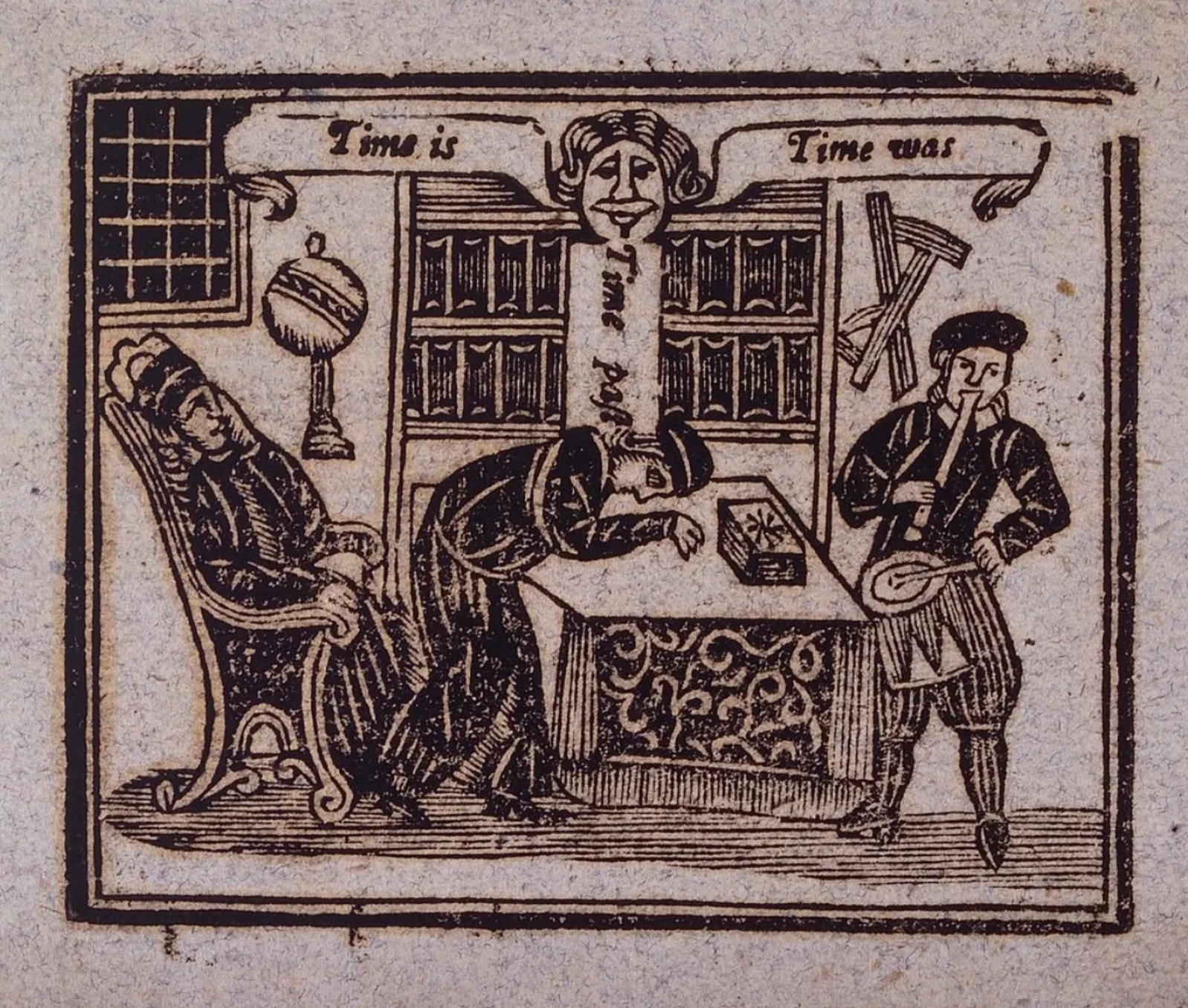 A man sleeps between Roger Bacon (?) and a musician: a brass head proclaims time present and the past. Woodcut, ca. 1700-1720. Via Wellcome Collection. Public Domain Mark.