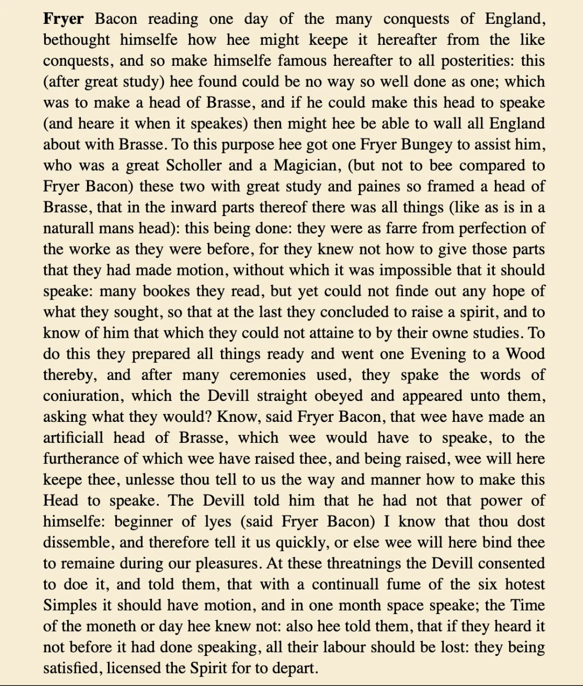 The University of Chicago maintains a detailed page concerning Sir Thomas Browne — who we will read about shortly, and who penned his own explication of the play. The full text of the history and explication is included there. The main portion detailing the making of a brass head, or head of “Brasse,” can be seen below sourced from the University’s page: